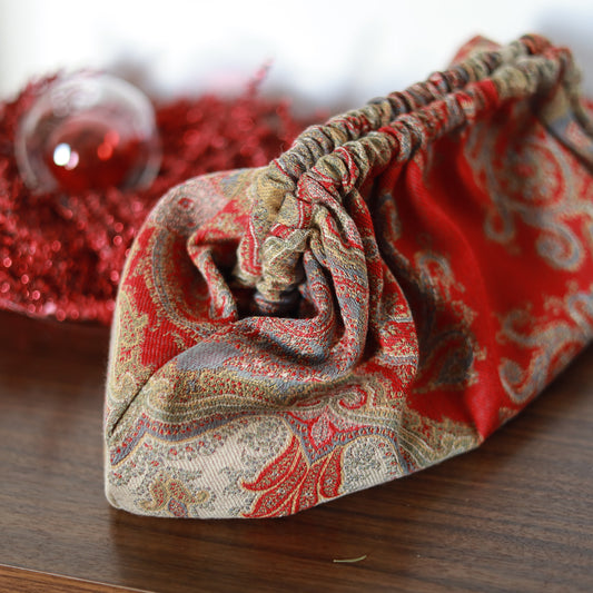 5 clutches speciali, realizzate in velluto, lana e seta nei toni del rosso, oro e champagne in tessuti ETRO e Designersguild.