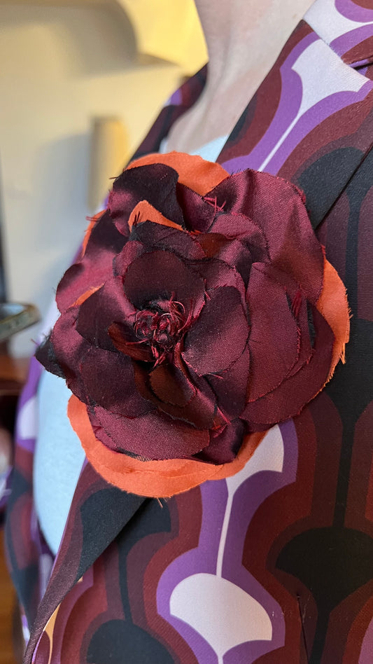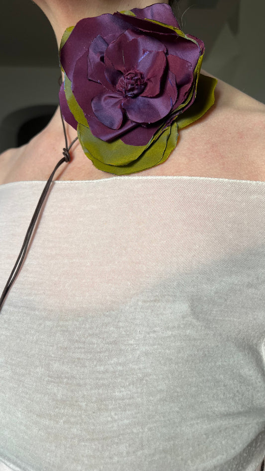 Con filo in cotone cerato e fiori fatti a mano con tessuto in Taffeta in pura Seta.