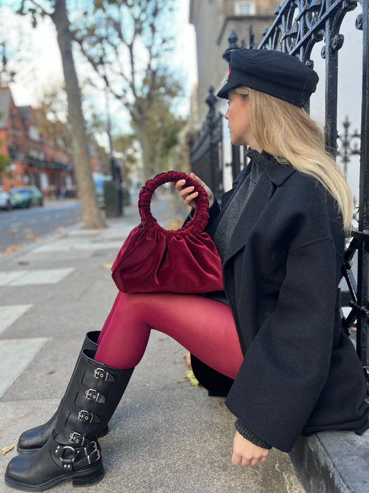 La Voilà Bag è una borsa realizzata interamente a mano, è un modello unico nel suo genere perchè viene realizzato solo in velluto tinta unita, sempre con il fine della sostenibilità utilizzando rimanenze di tessuti.