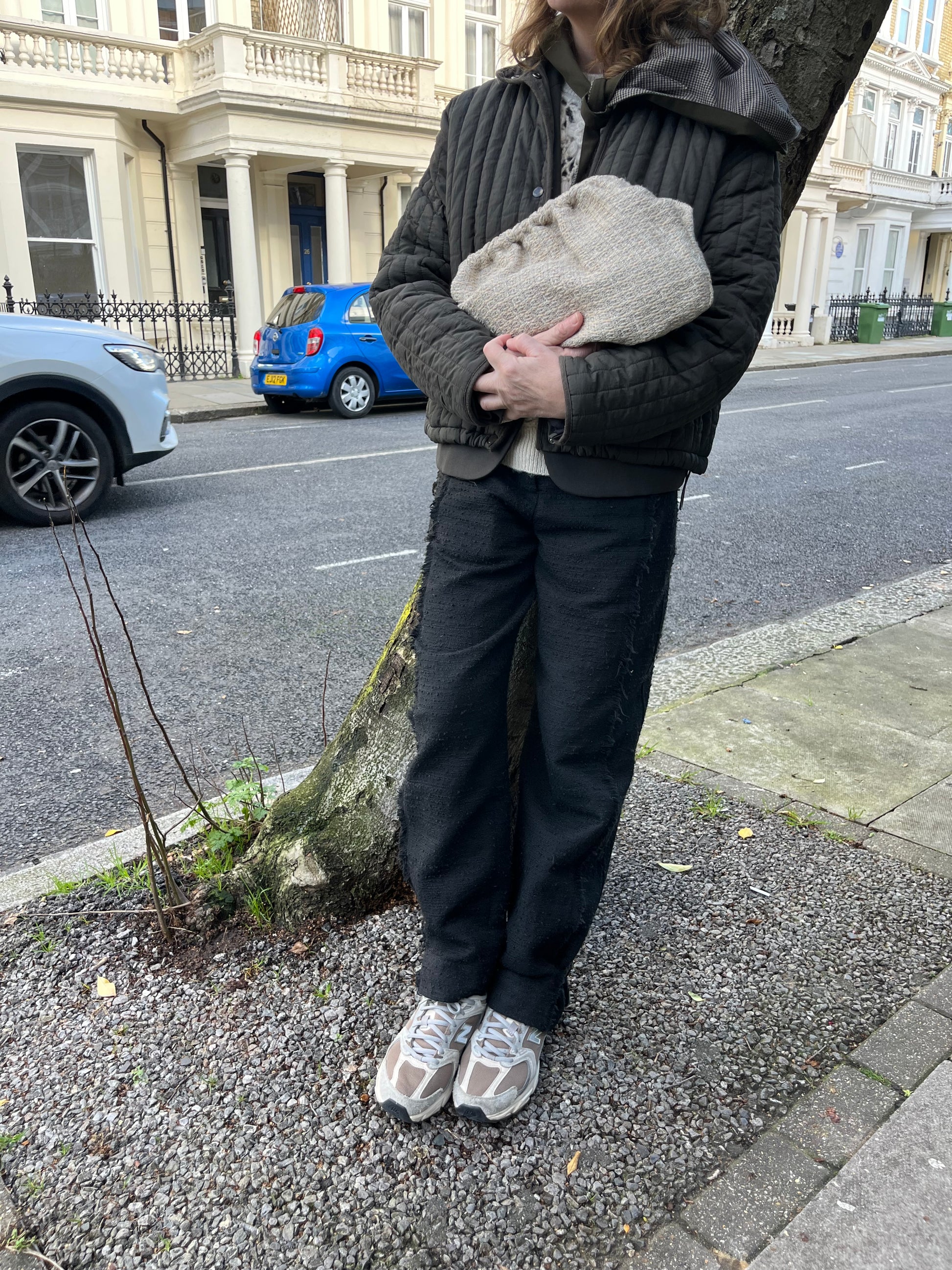 Clutch Standard - realizzata a mano con tessuto jacquard di Dedar Milano in lino e viscosa color Écru/beige/sabbia con una trama intrecciata e materica con fili in lurex che danno luminosità.