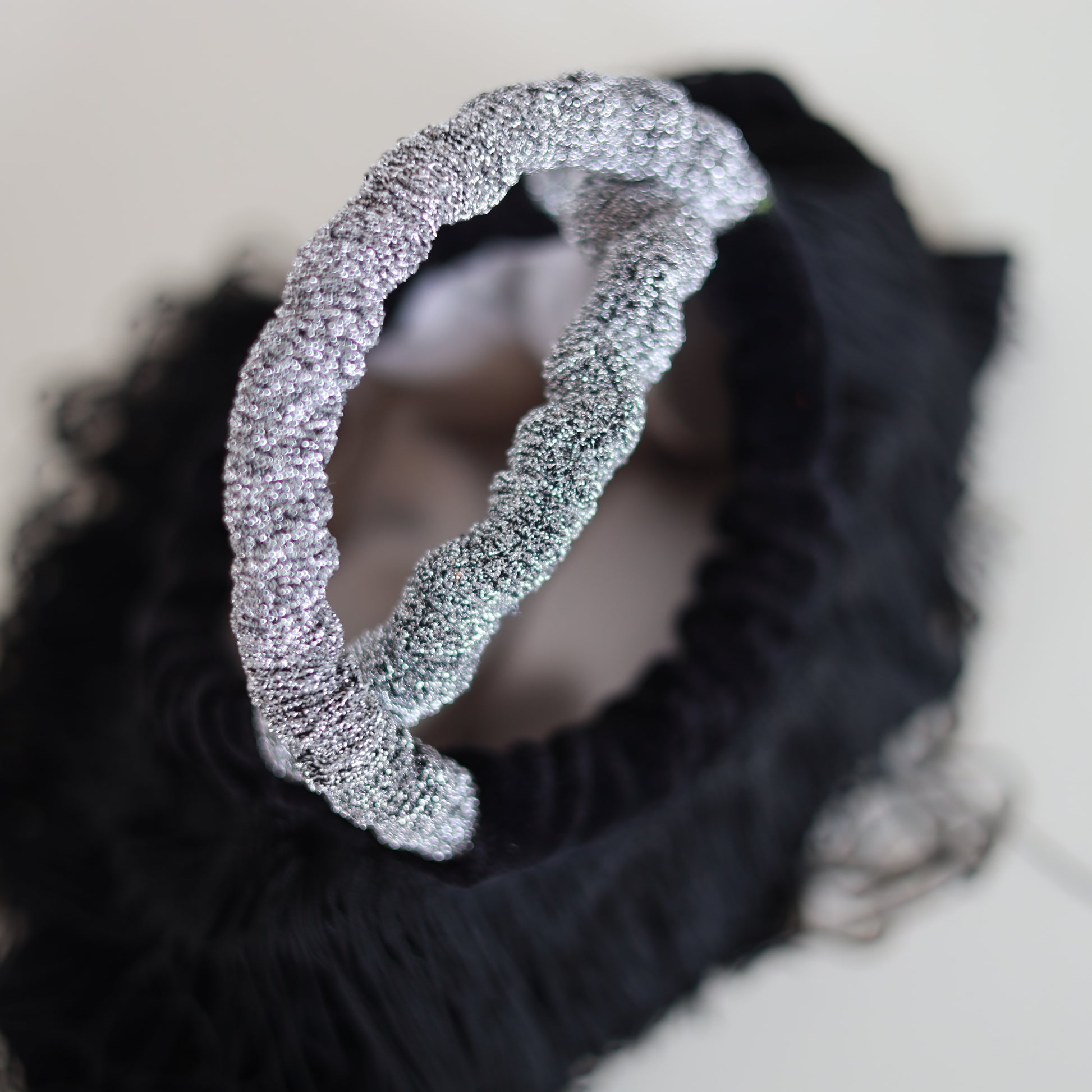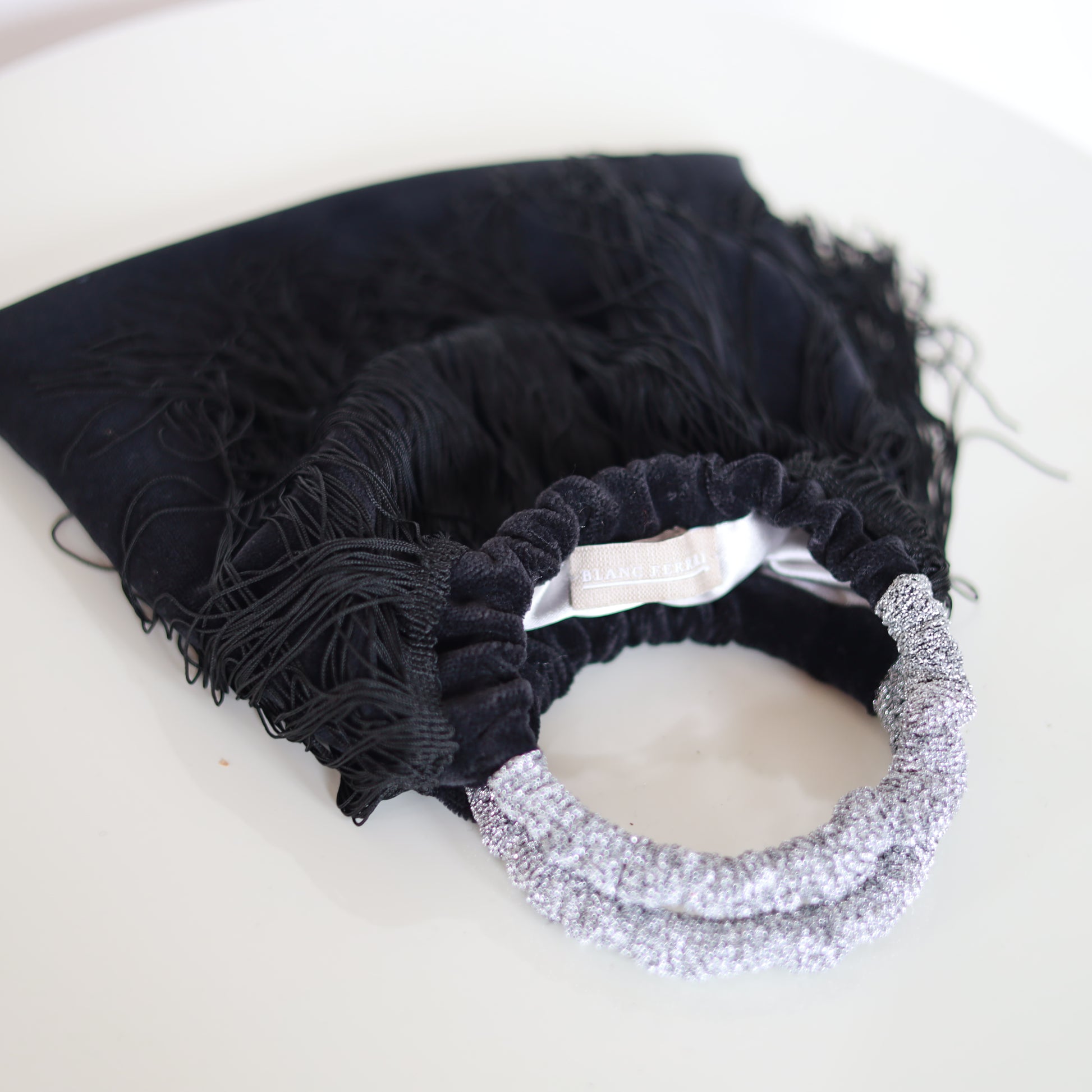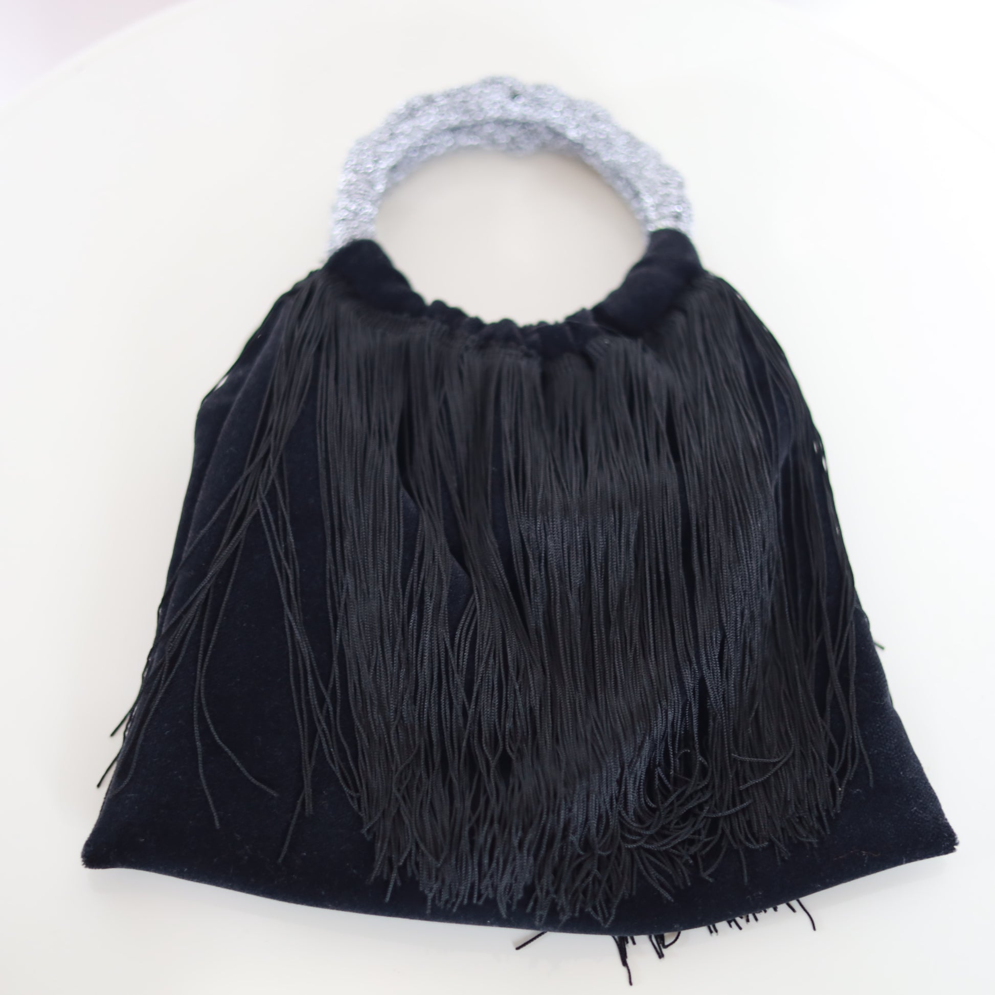 È un pezzo unico esclusivo in Velluto nero, con aggiunta di frange in viscosa cucite a mano che la rendono ancora più particolare. I suoi manici preziosi sono stati cuciti a mano metà in velluto e metà in maglina in lurex. Un pezzo esclusivo perfetto per Capodanno o qualsiasi evento elegante.