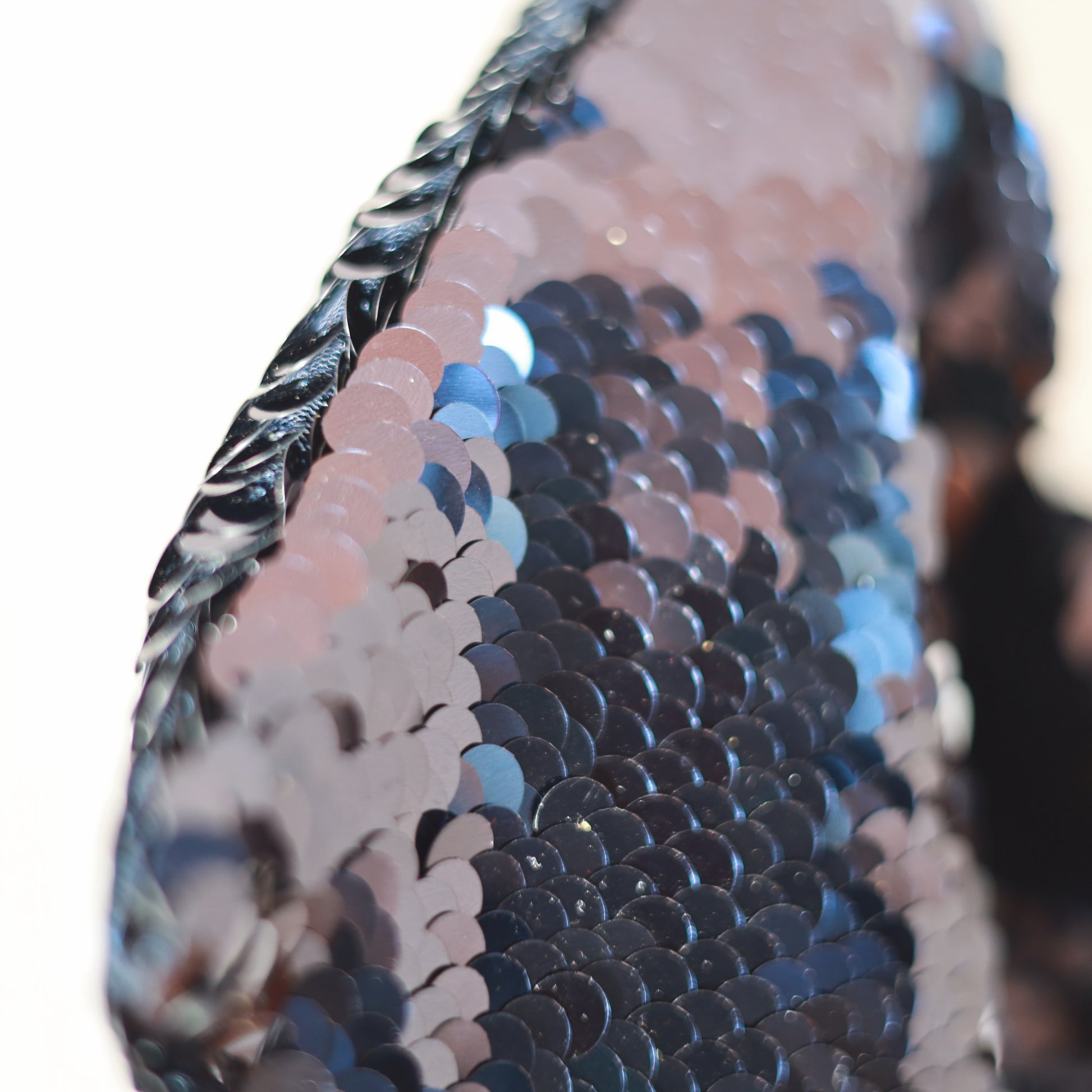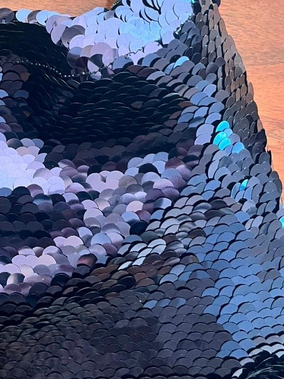 È un tessuto prezioso in Pailletes blu con una forma effetto squame, che ctra un bellissimo gioco di luce e tridimensionalità. Il colore delle pailettes blu notte ha un effetto cangiante che in base al movimento va al turchese e al viola metallizzato.