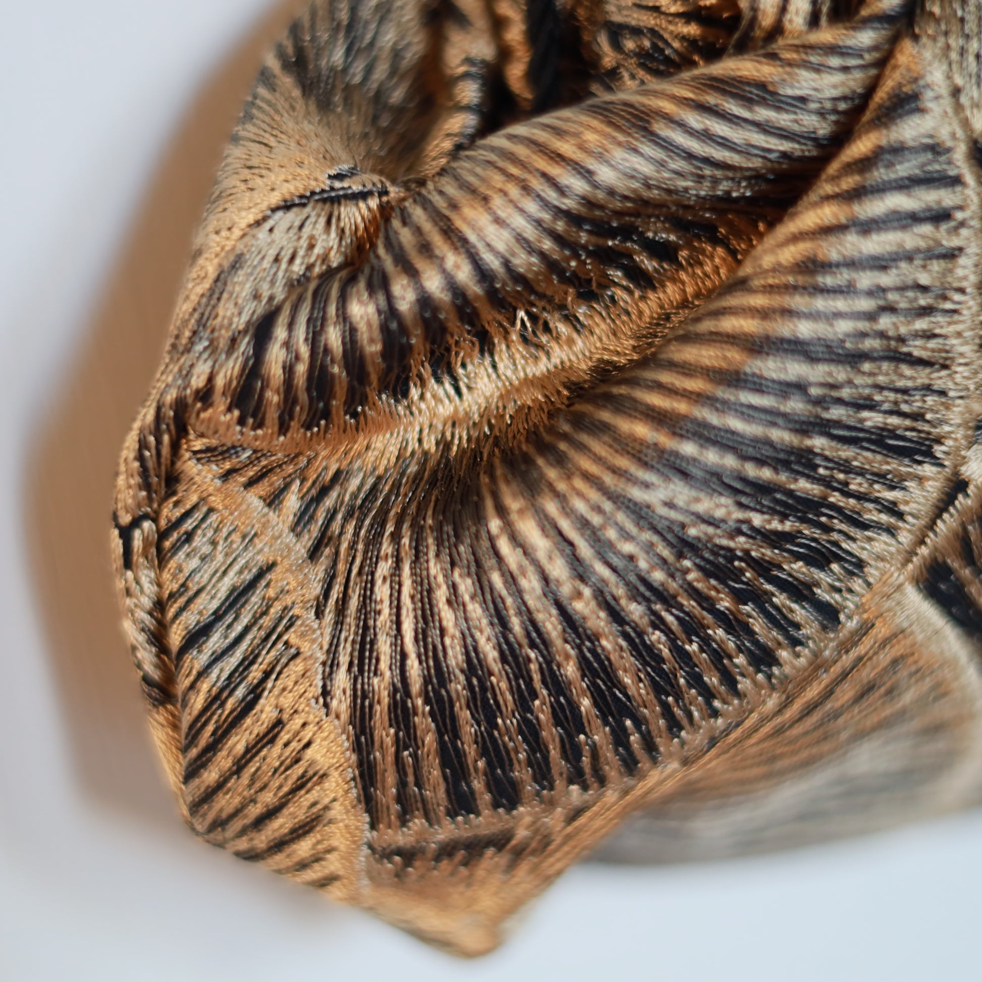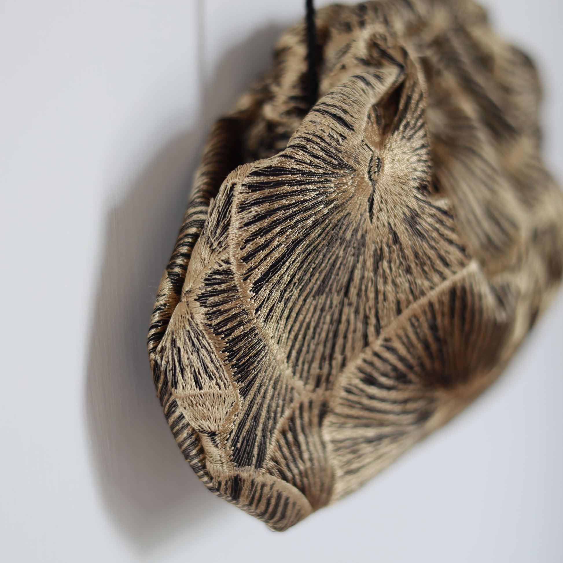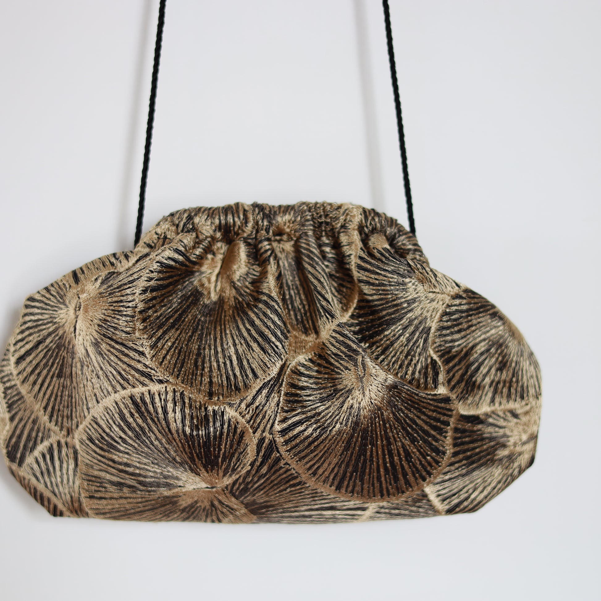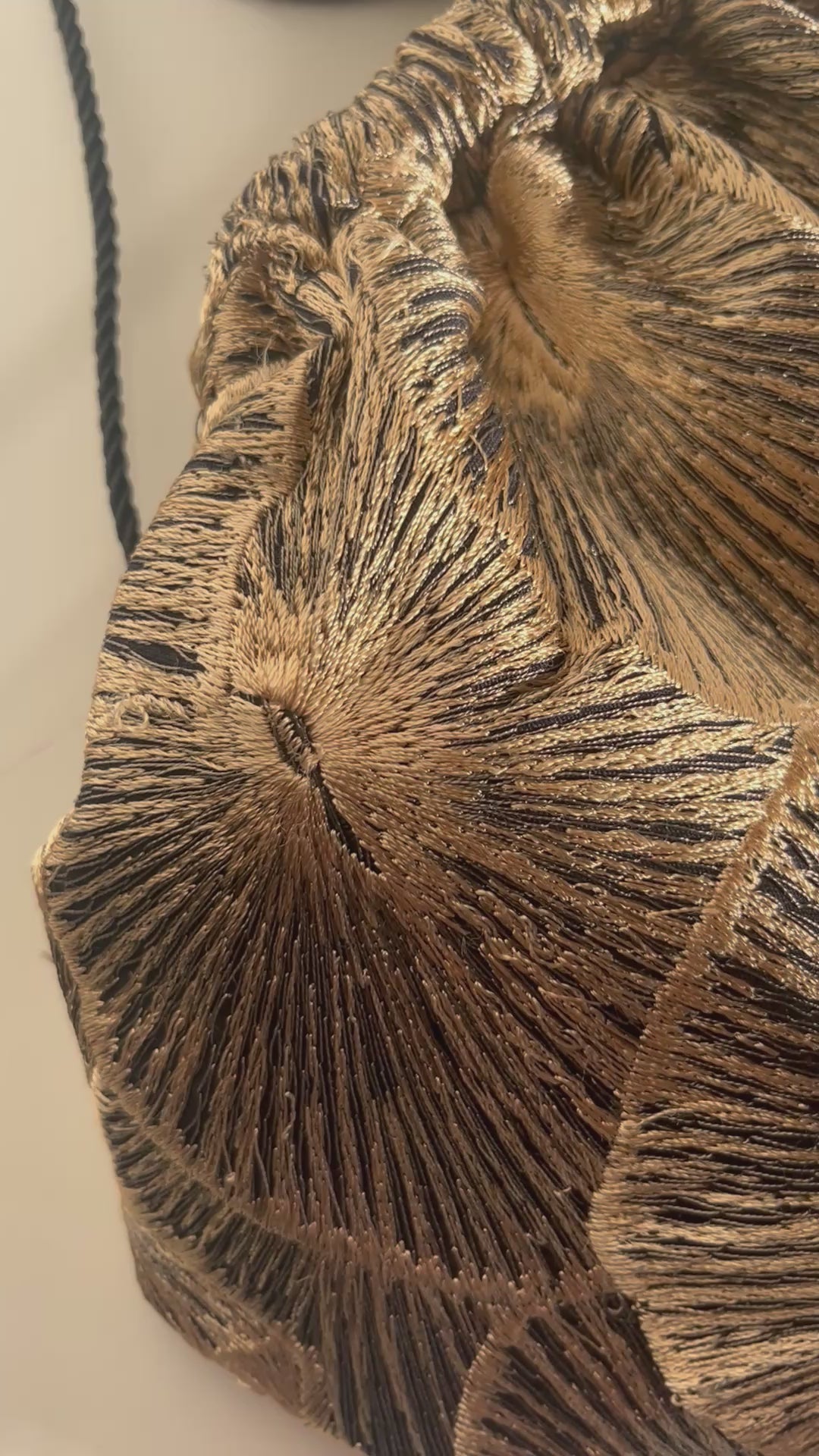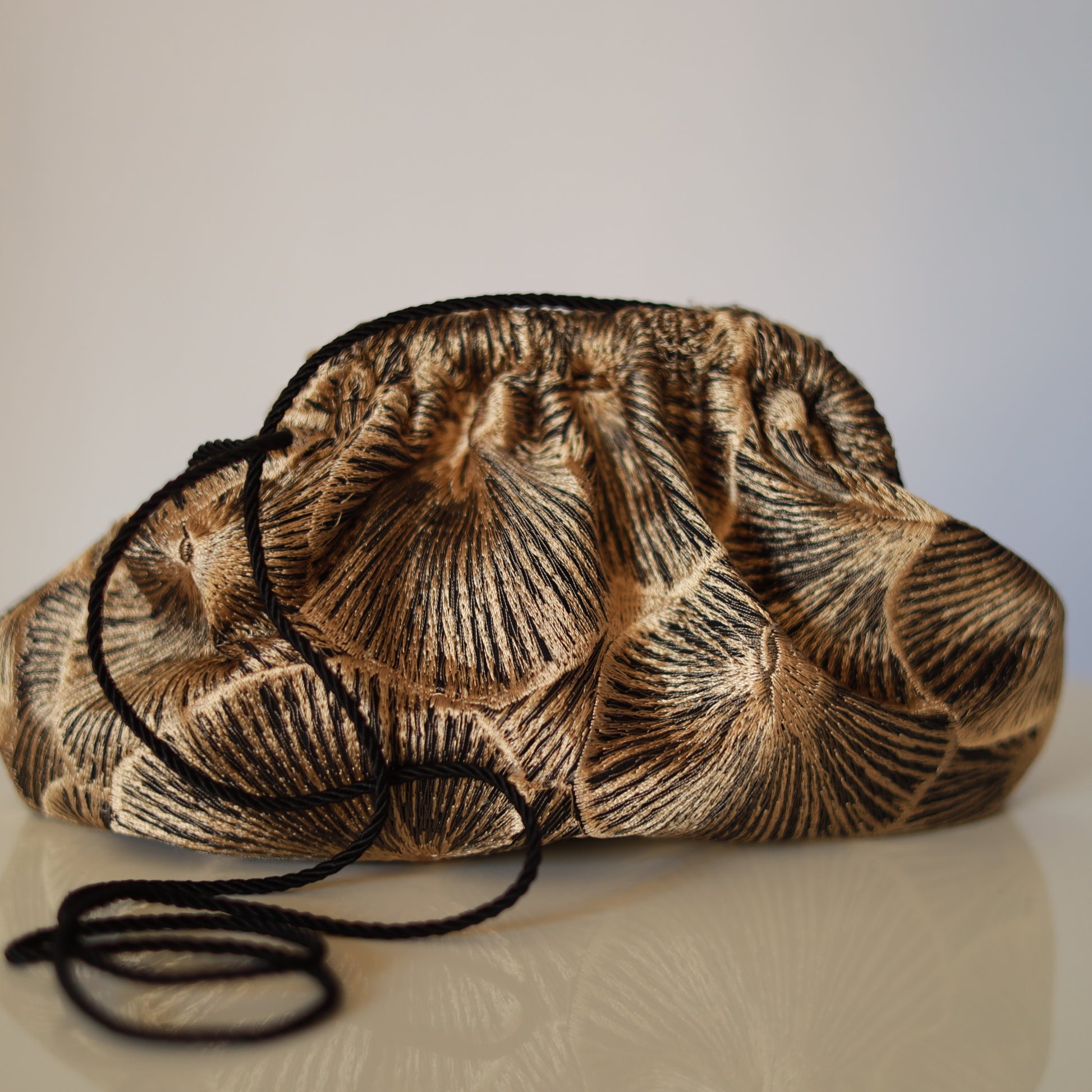 Mini Clutch - in un prezioso tessuto jacquard in seta e viscosa firmato LIZZO (Luxury Brand Interior Designer Spagnolo). Un tessuto unico e particolare nella fantasia giapponese che richiama la foglia di Lotus, nella colorazione nero, oro e ambra.