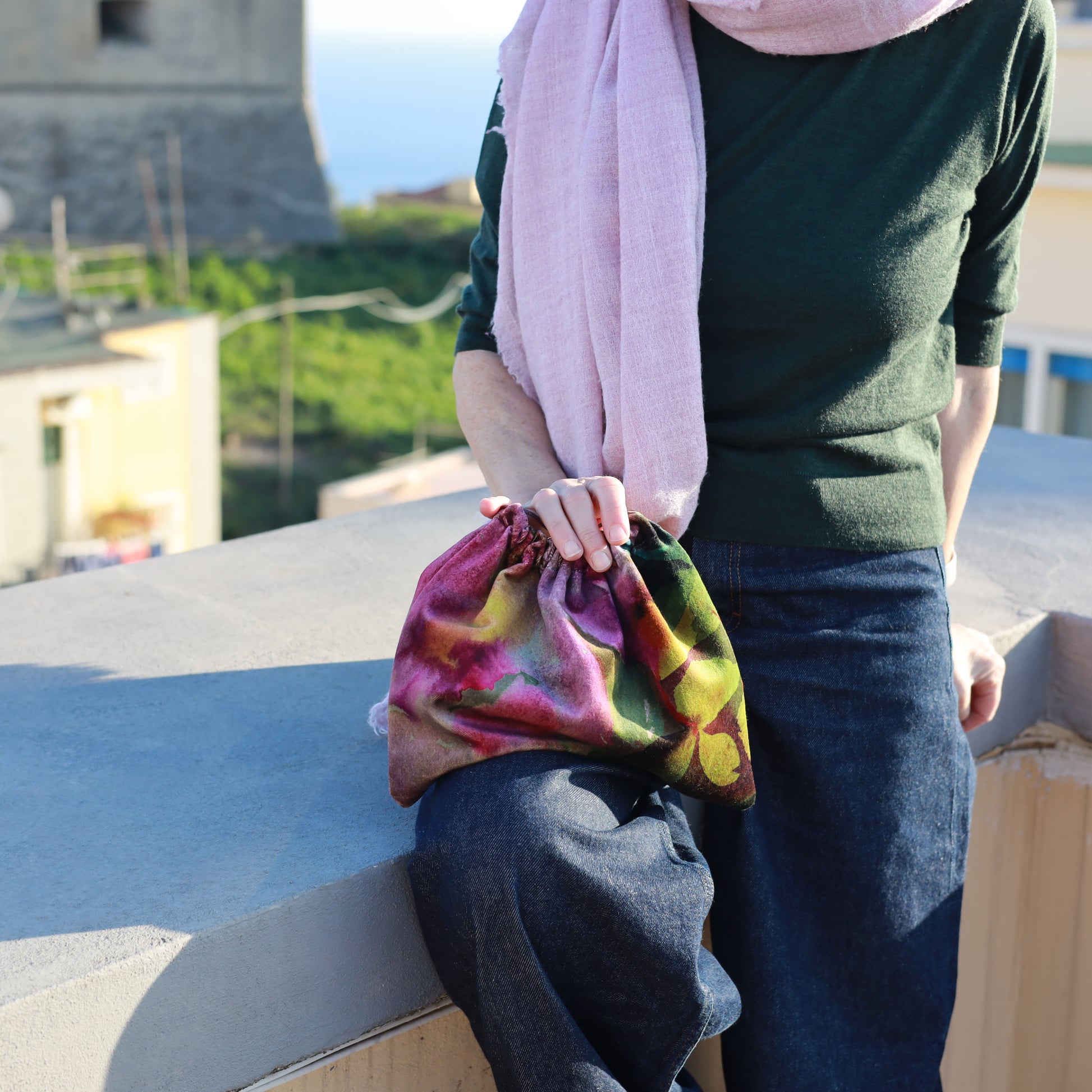Bisaccia in Velluto Designersguild fantasia floreale multicolor pitturata a mano con nastrini in lurex color viola per portare il sacchettino a mano.
