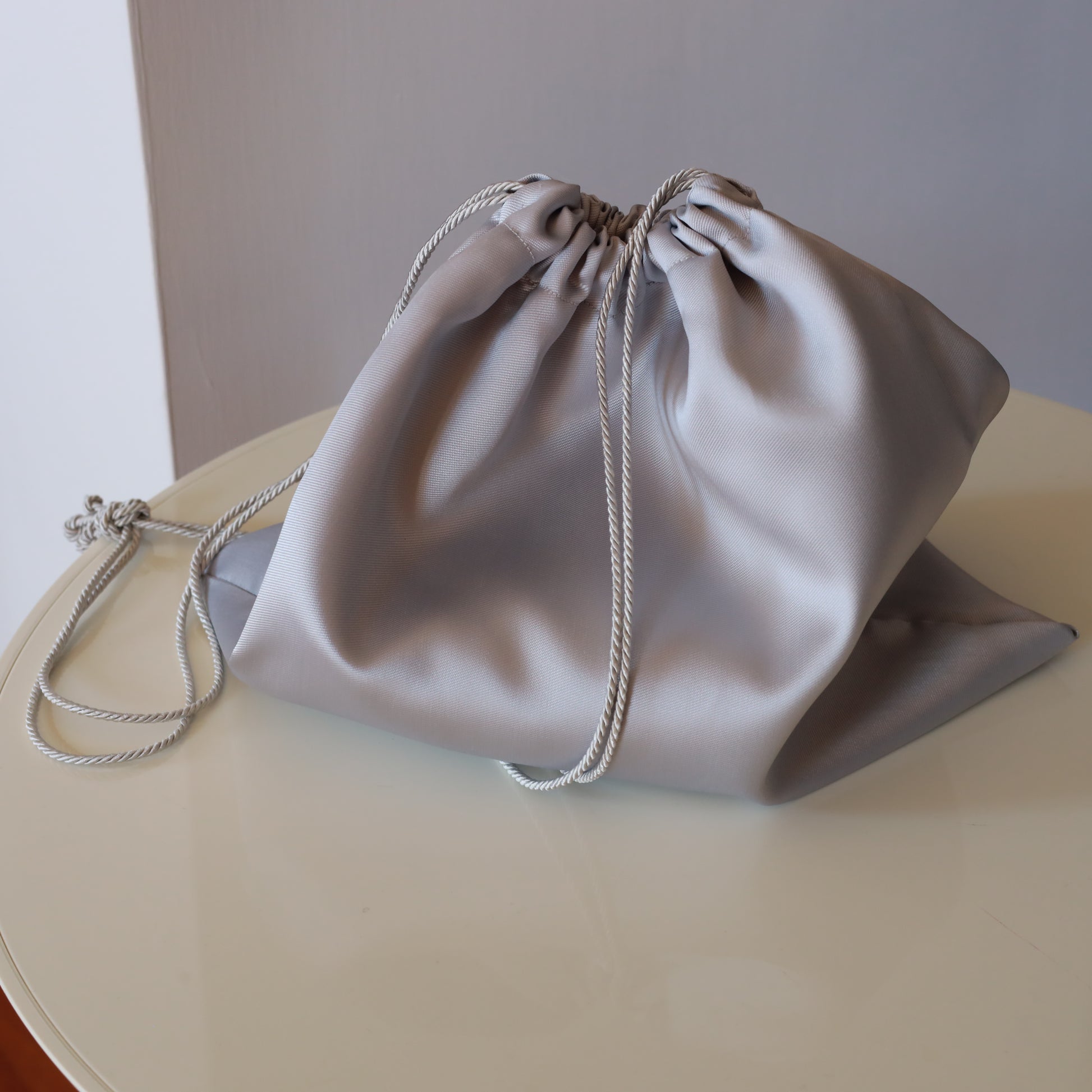 È un sacchetto in mikado di seta nella colorazione Silver Grey. Con una tracollina in seta da portare sulla spalla o a mano.