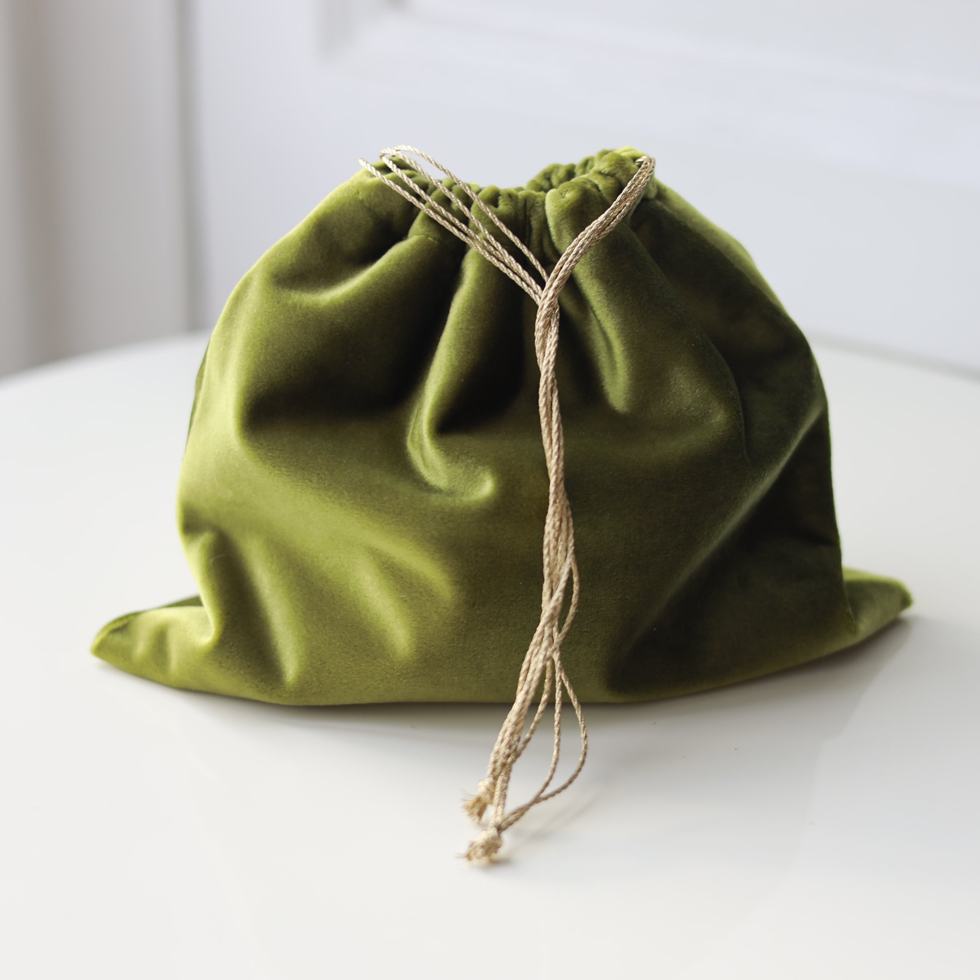 Bisaccia in Velluto Designersguild color Verde Oliva con nastrini in lurex dorati per portare il sacchettino a mano.