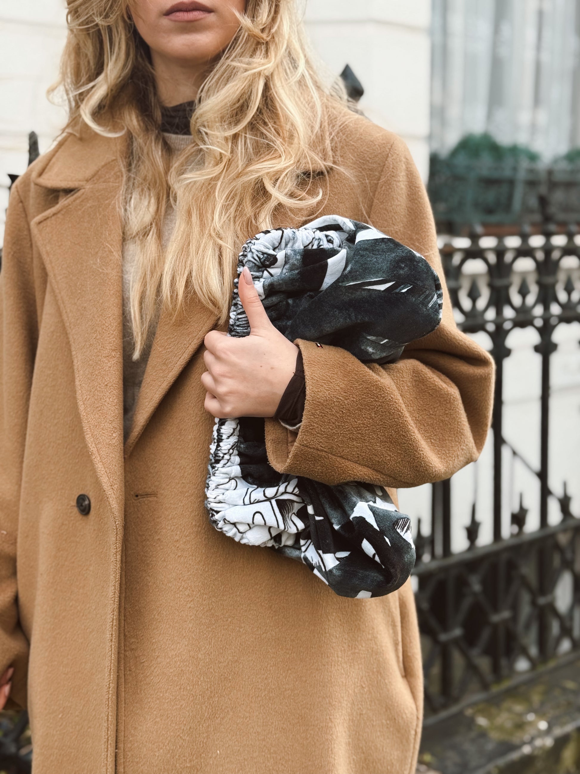 Clutch Large - realizzata a mano in tessuto Velluto di Designersguild con fantasia floreale astratta nei toni del nero, marrone testa di moro e bianco.