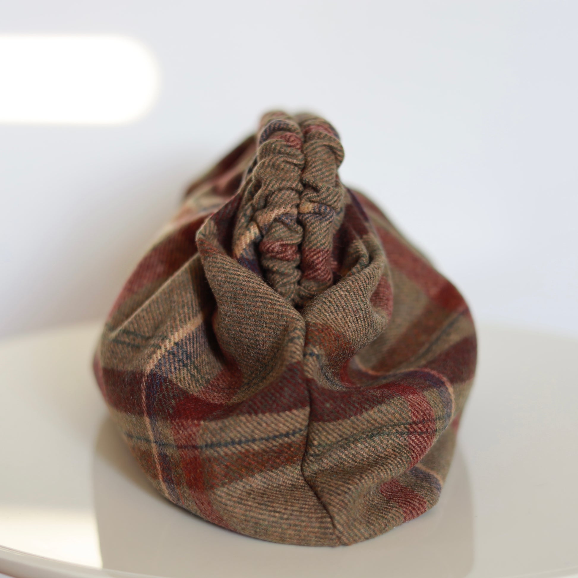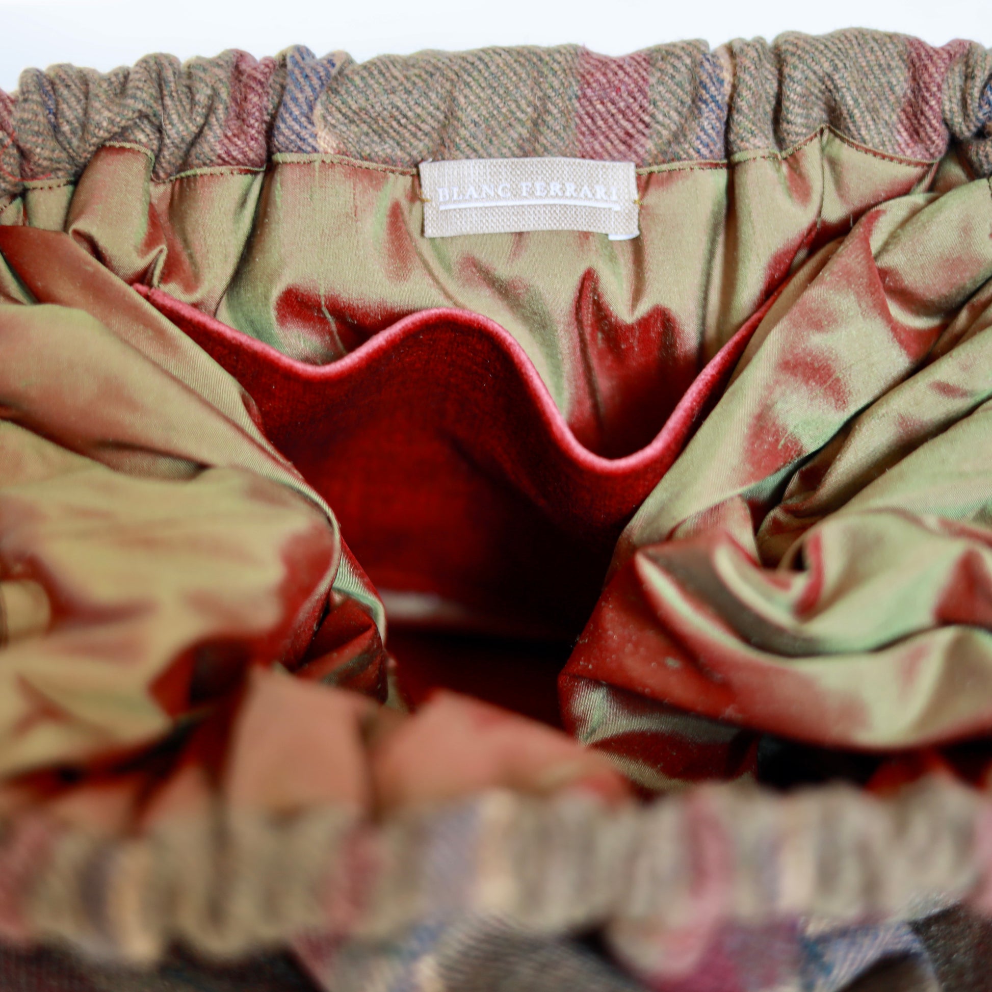Clutch Standard in lana tessuto Ralph Lauren. Fantasia Tartan dai toni autunnali e caldi base verde Khaki con intrecci in Borgogna, marrone nocciola e blu Cina.