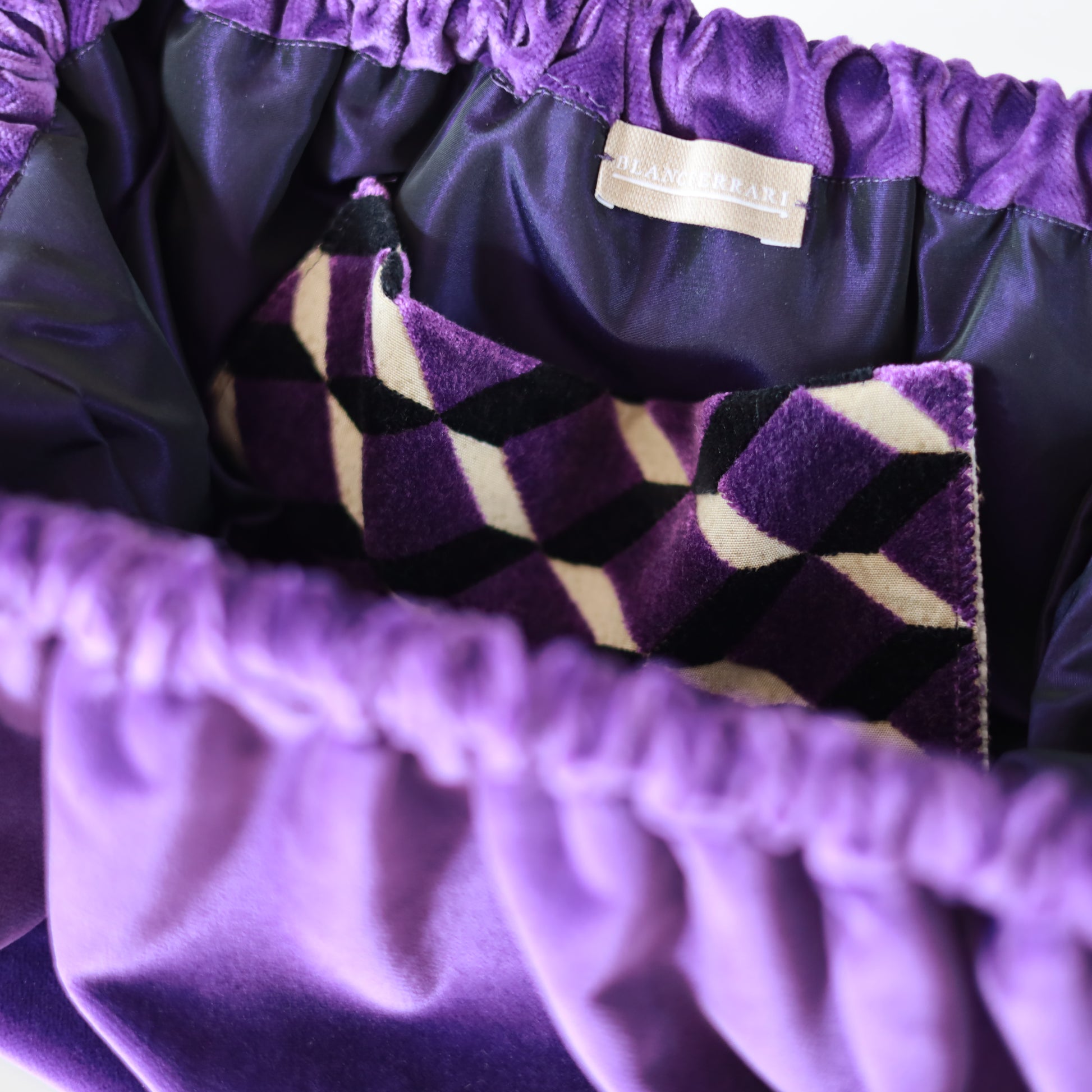 Interno in seta color Viola Cangiante e taschino in velluto abbinato con una fantasia geometrica.
