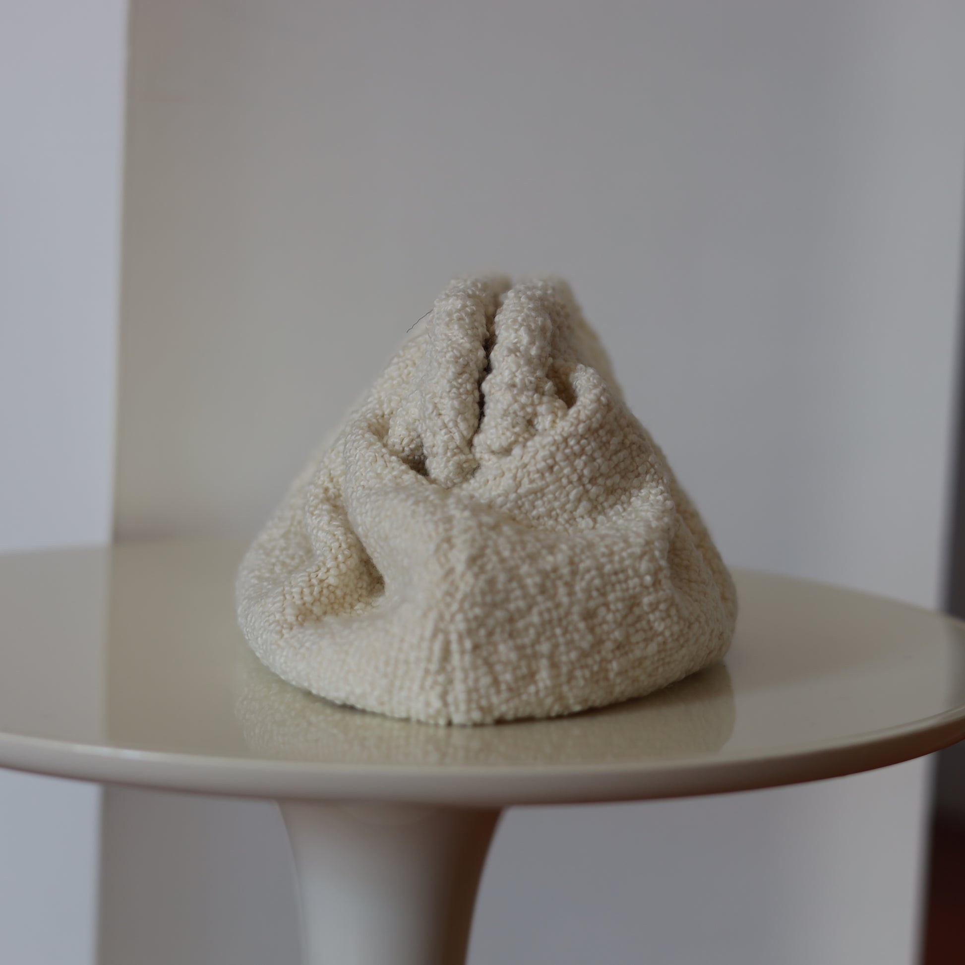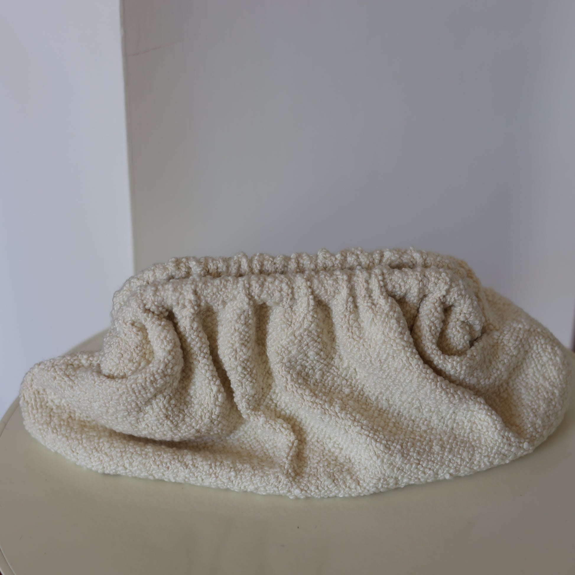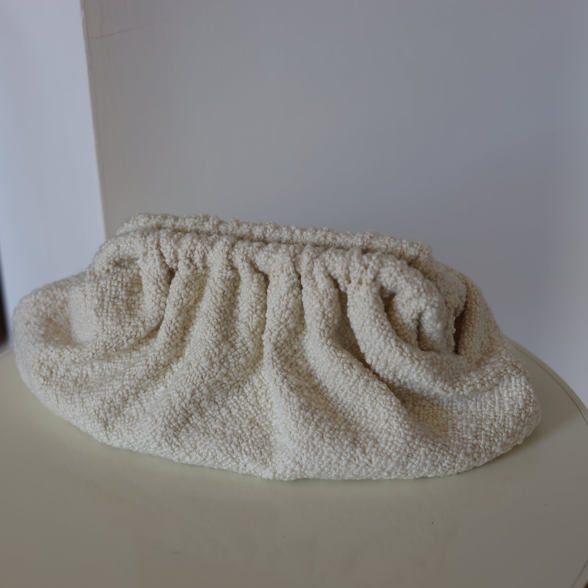 Clutch Standard - realizzata a mano con tessuto morbido in bouclé di Dedar Milano nella colorazione Cloud Dancer.